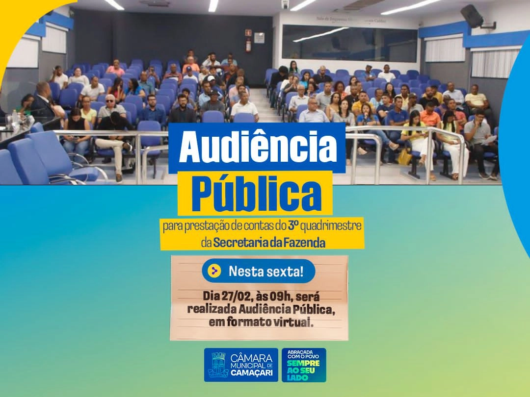 Será realizada na sexta-feira (27/02), a partir das 9h, a Audiência Pública para prestação de contas do 3ª quadrimestre de 2025 da Secretaria Municipal da Fazenda. A atividade será realizada virtualmente e o objetivo é apresentar aos vereadores e à comunidade dados relativos à receita, despesas e o relatório de execução orçamentárias com análise do cumprimento de metas no período.