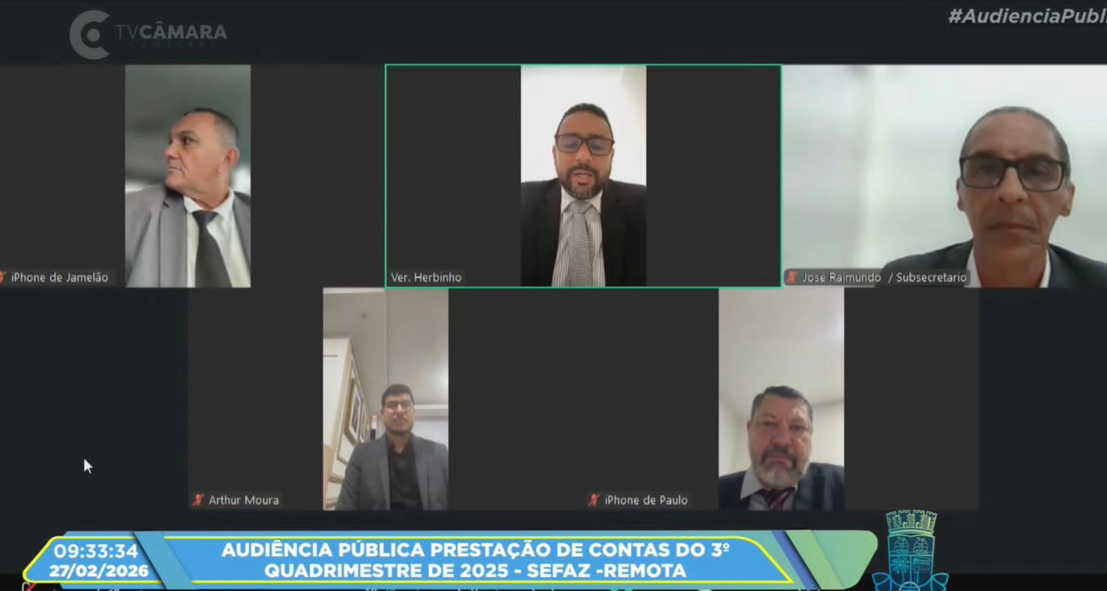 Na manhã desta sexta-feira (27/02), a Câmara Municipal de Camaçari realizou uma audiência pública virtual, com transmissão ao vivo pelo YouTube, para apresentação da prestação de contas referente ao 3º quadrimestre de 2025. A atividade foi promovida pela Secretaria da Fazenda de Camaçari (Sefaz), em cumprimento às exigências legais de transparência fiscal.