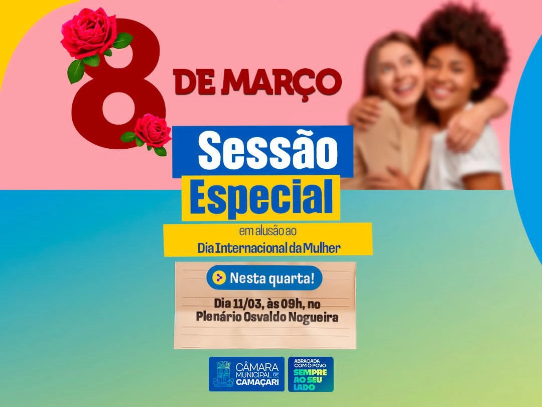 A Câmara Municipal de Camaçari realizará, na quarta-feira (11/03), a partir das 9h, no Plenário Osvaldo Nogueira, a Sessão Especial em homenagem ao Dia Internacional da Mulher, comemorado em 08 de março. A atividade foi solicitada pela vereadora Neidinha (PT), e reunirá mulheres importantes para a história do município.